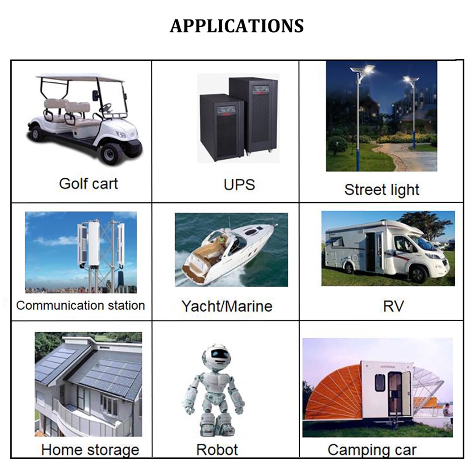 ◆ Applications: Engine starter battery, electric bicycle / motorcycle / scooter, golf cart / stroller, power tools, solar and wind energy systems, RVS, caravans, backup systems and UPS, LED flashlight emergency light.