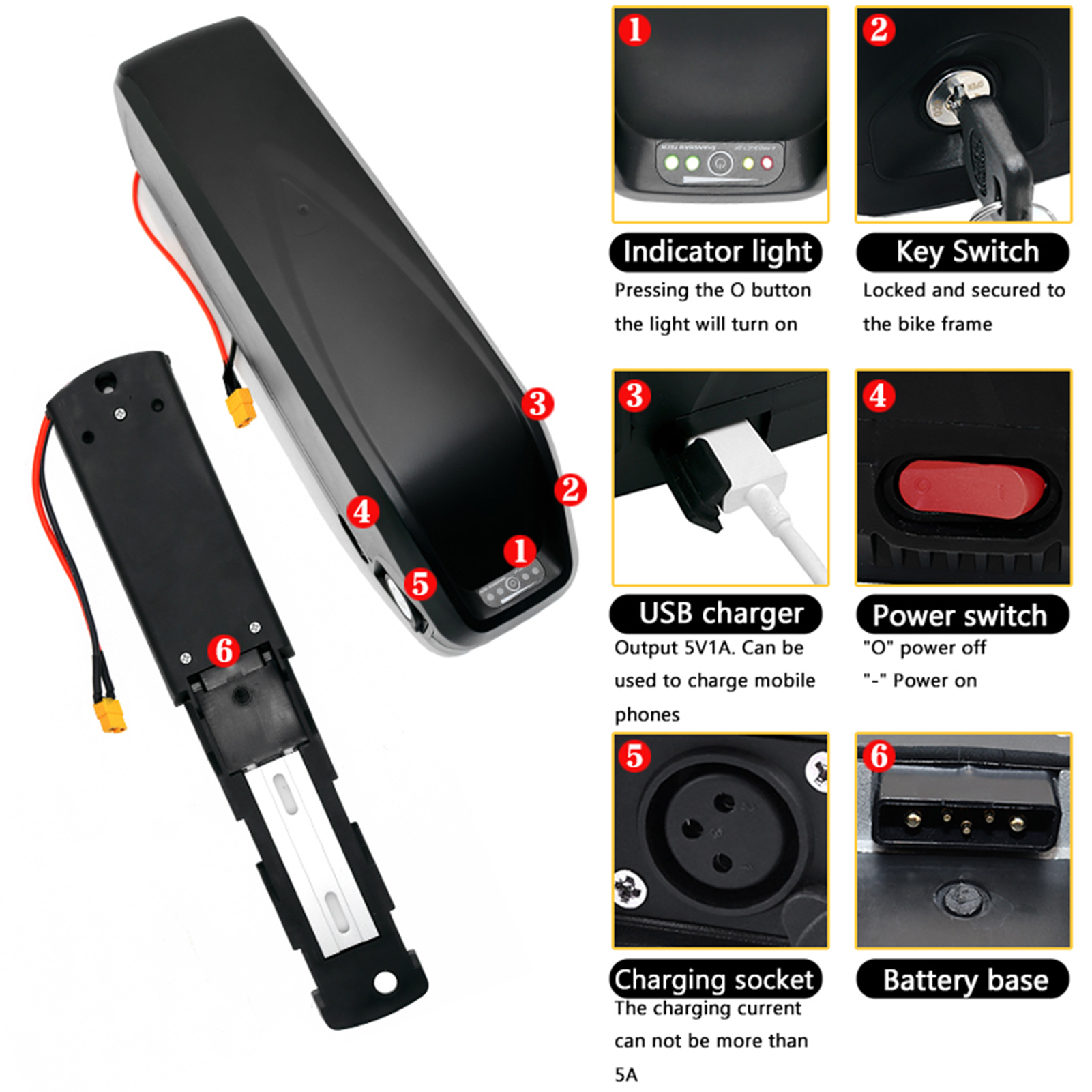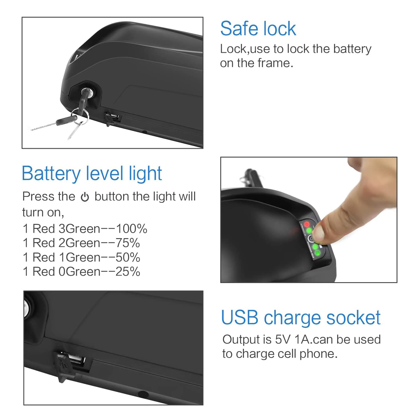 1.USB Charging Cellphones: Our E-bike battery can charge your cellphones anytime, anywhere.