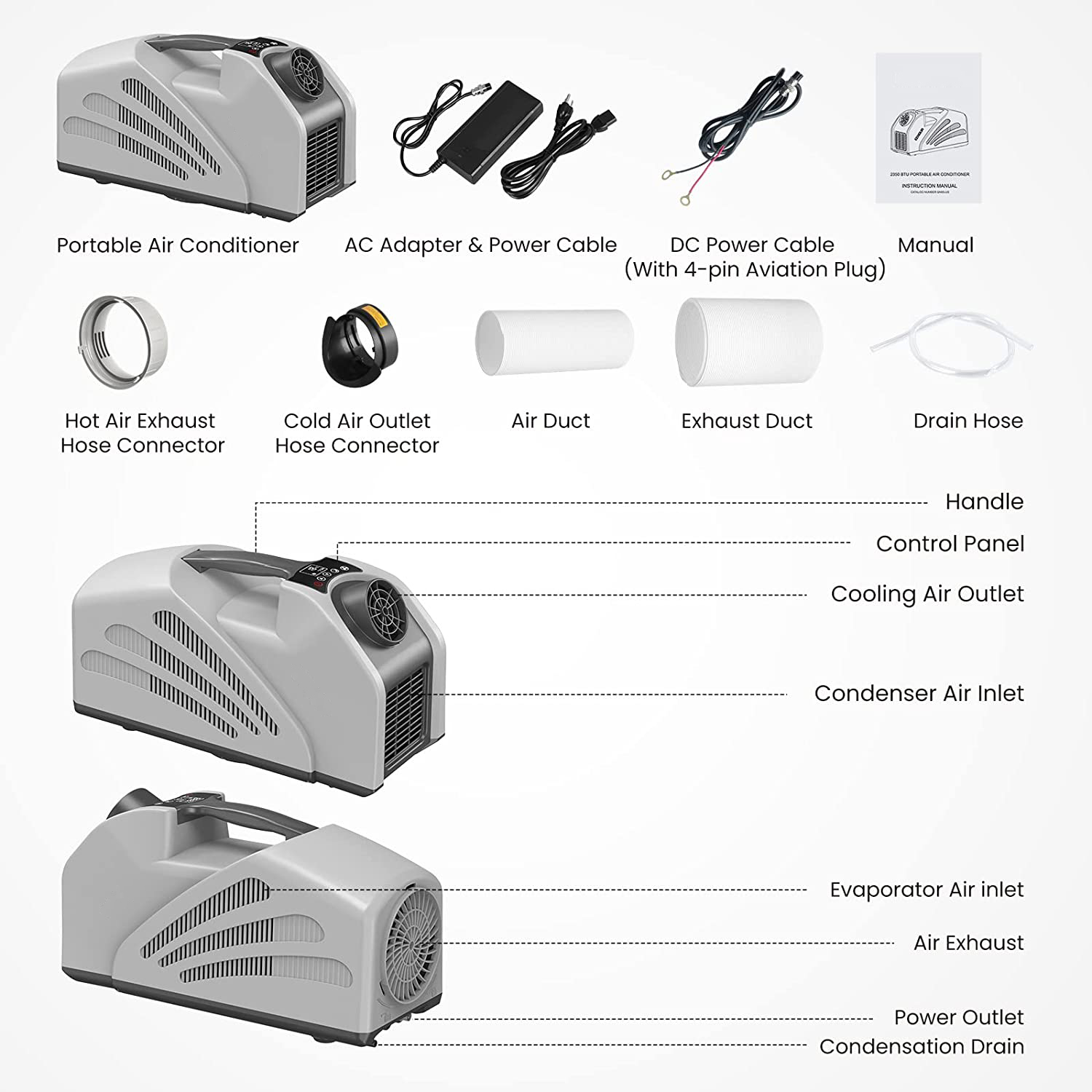- Note: 1. The cooling capacity of regular air conditioners does not interfere with the integrated design. In addition, for efficient cooling, the exhaust duct will need to discharge the heat out when used in a closed space. Thank you for your understanding. 2. Note: Although it is compatible with 24V sub batteries, please refrain from using a 12V/24V cigarette lighter socket or a DC to AC inverter/converter. This may lead to product failure